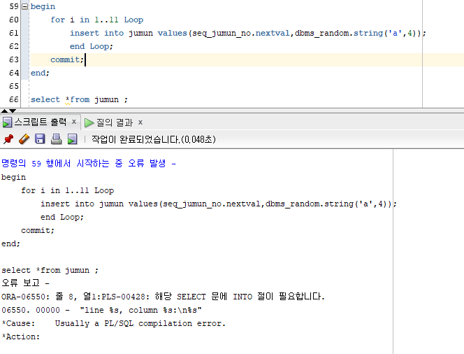begin문때문인지 for문때문인지 저런오류가 발생하더라