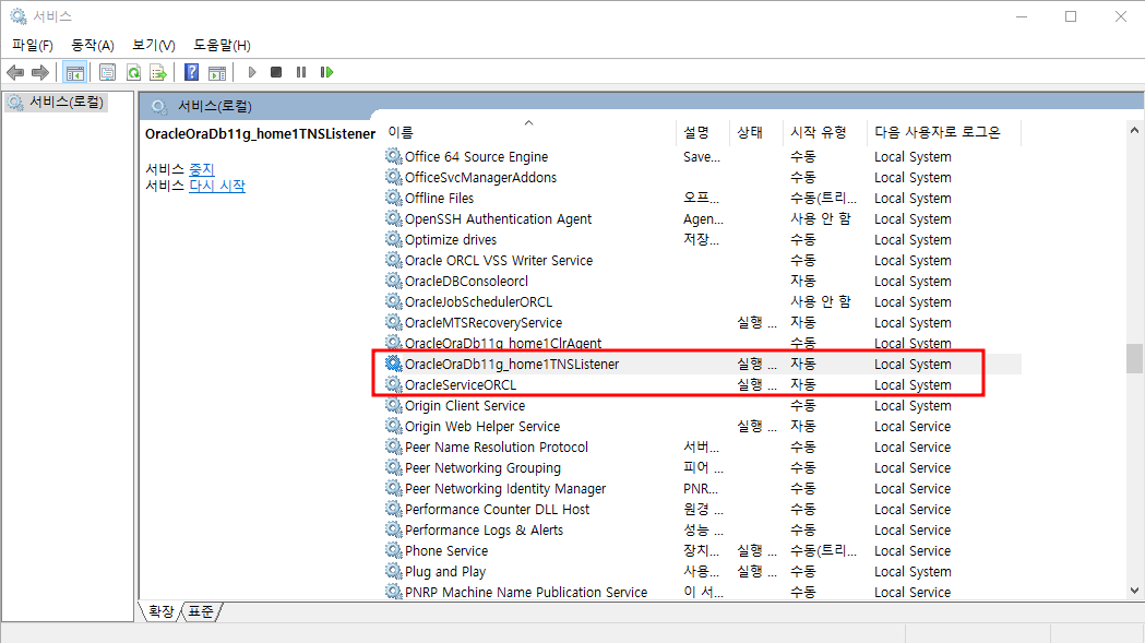 Listener와 orcl을 오른쪽 마우스 눌러서 실행을 해주자