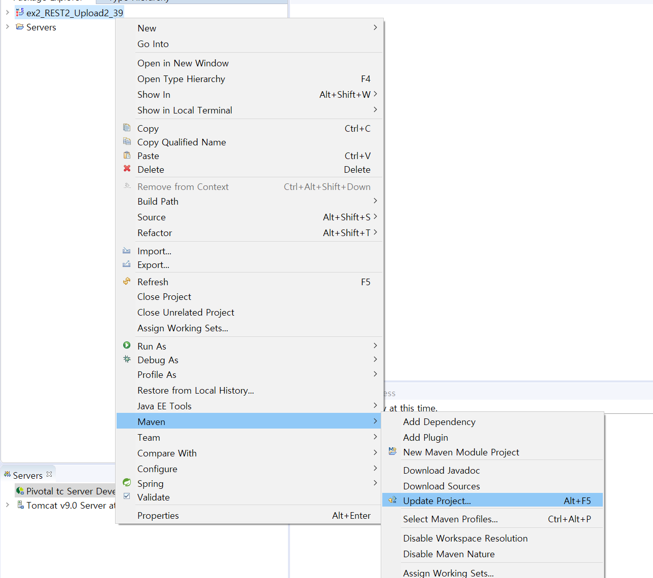 프로젝트에서 오른쪽 마우스 [Maven] -> [Update Project]