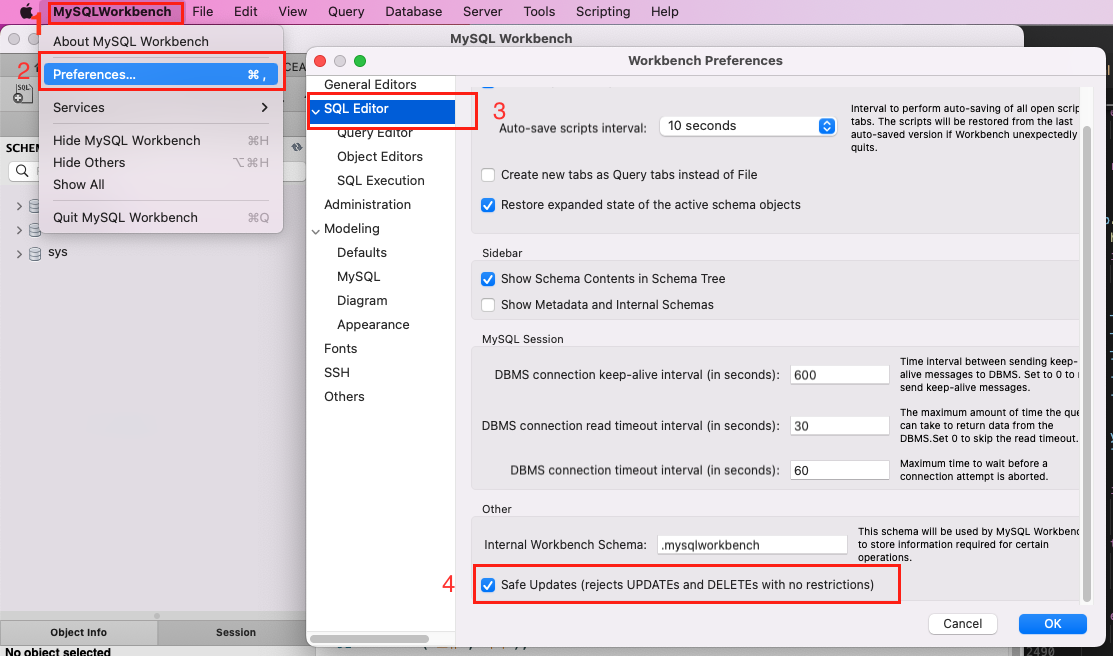 DB/mySQL [mysql] safe update mode 설정하기 (mac) 찬린이 2023. 5. 9. 19:05 공유하기 게시글 관리 찬린 'DB > mySQL' 카테고리의 다른 글 [mysql] workbench 예기치 않게 종료되었습니다 (version) (0) 2023.04.13 MySQL workbench 계정 생성, 권한부여 (0) 2022.01.27 'DB/mySQL' Related Articles [mysql] workbench 예기치 않게 종료되었습니다 (version) MySQL workbench 계정 생성, 권한부여